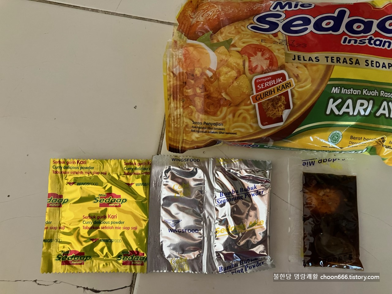 인니 라면의 기본 스프 세트인 국물 베이스 시즈닝, 액상 양념 스프, 고춧가루 시즈닝 3종 세트 외에 조리 후 마지막에 뿌리라고 조미 카레 가루가 추가했다.