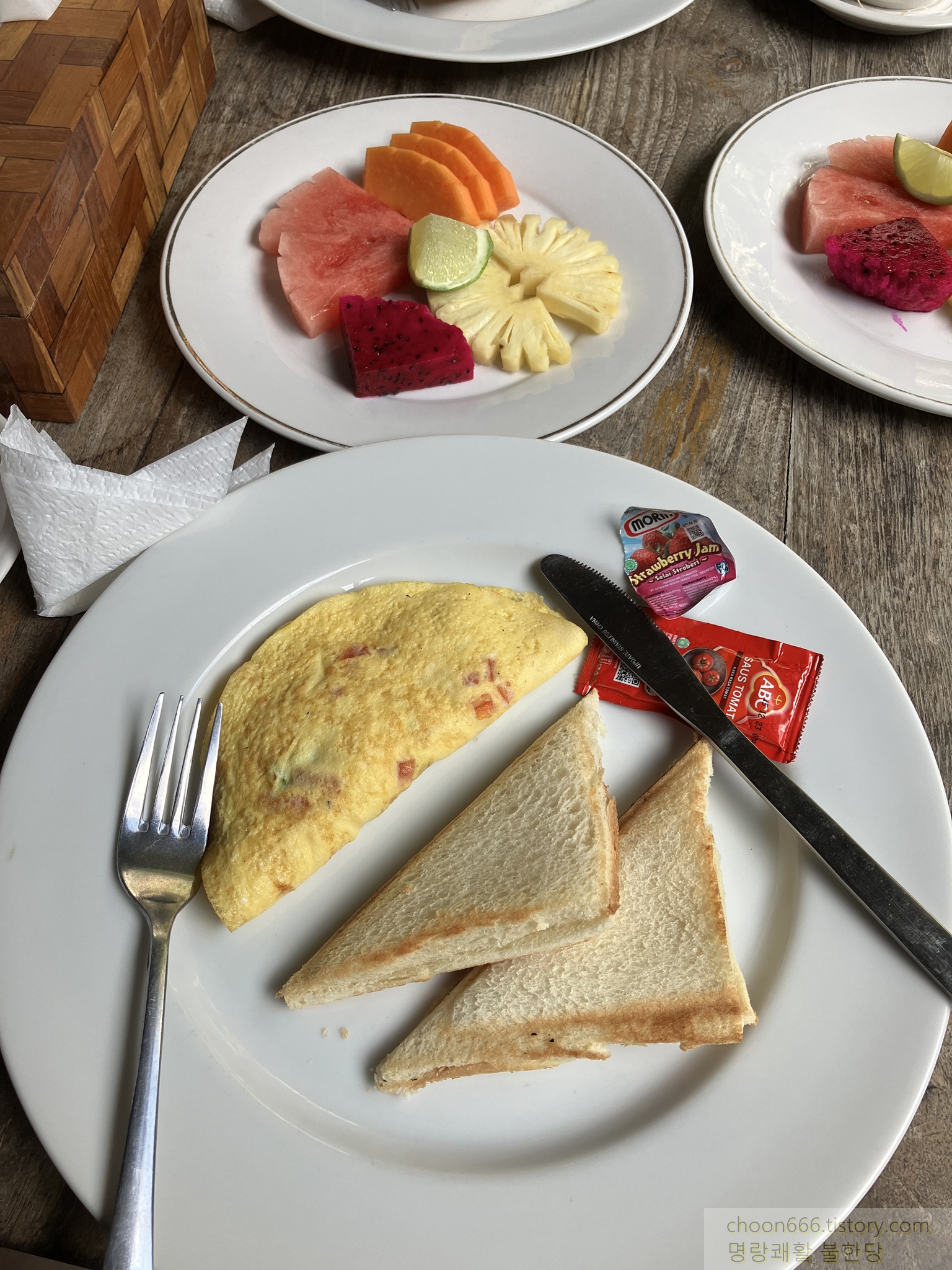 조식으로 나온 오믈렛과 토스트, 과일. 토스트 사이에는 '나름' 치즈도 들어있다.